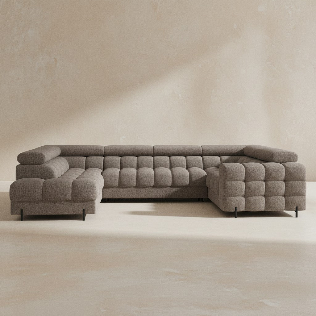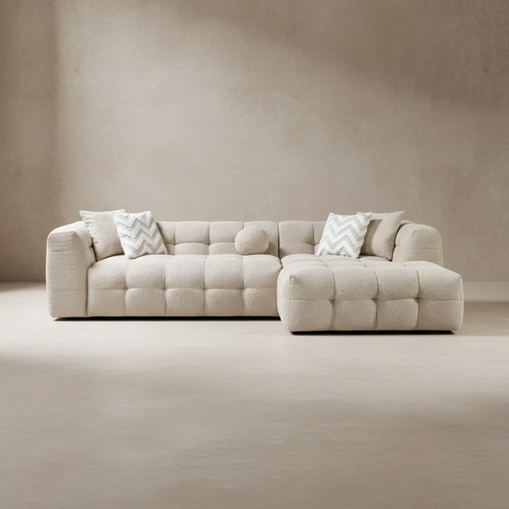 Sofa sectionnel en L deux pièces en bouclé ivoire avec chaise longue et coussins décoratifs...