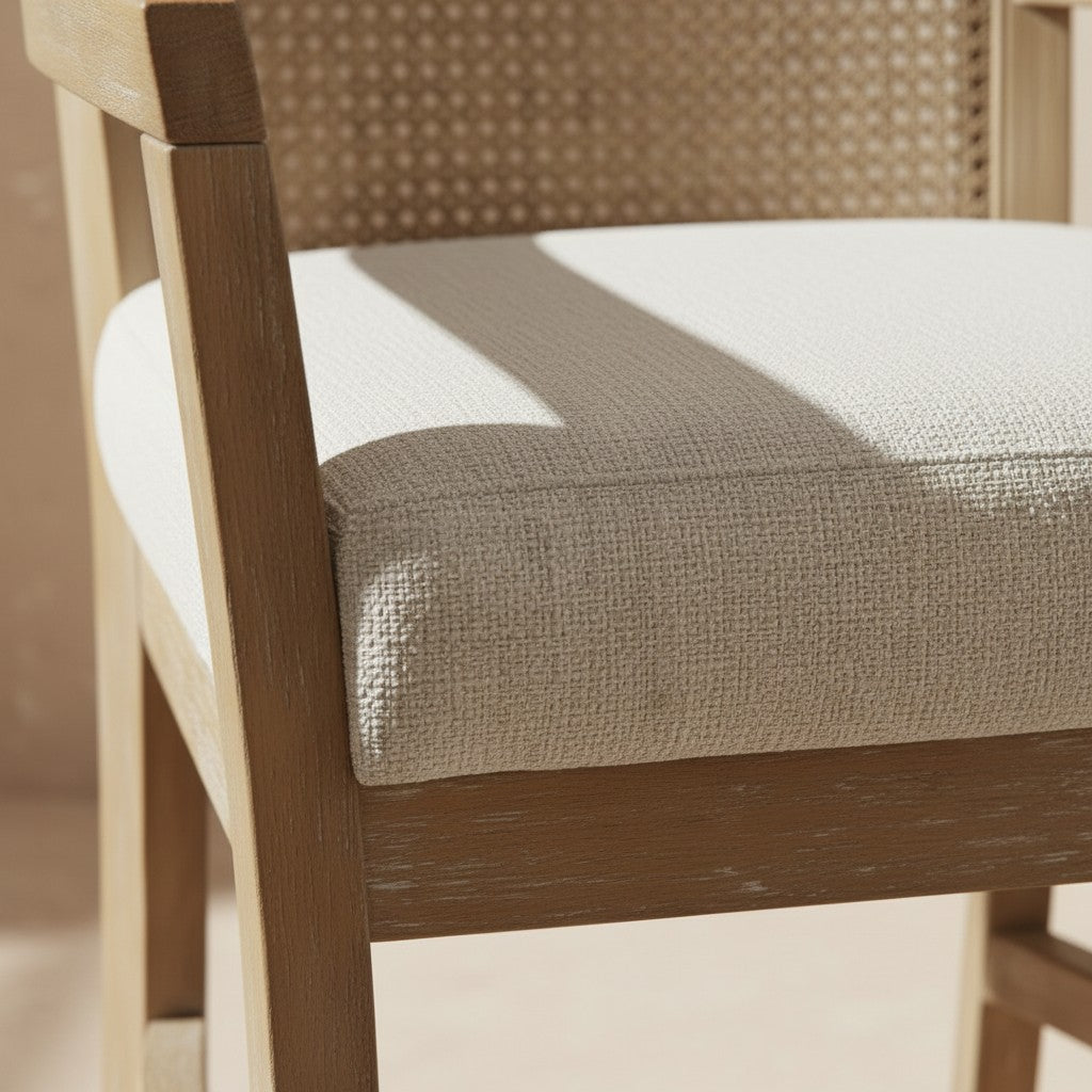 Une silhouette douce et contemporaine où le tissu beige texturé rencontre la chaleur du bois massif naturel.