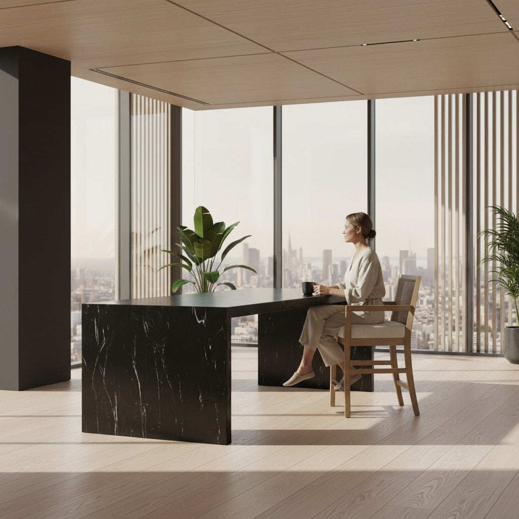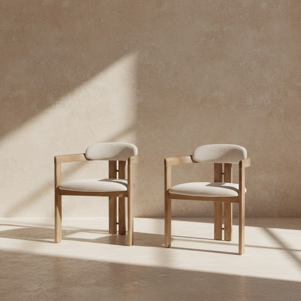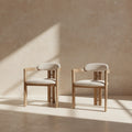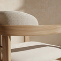 Ses accoudoirs intégrés et ses lignes sculptées créent une présence raffinée et intemporelle autour de la table.