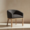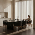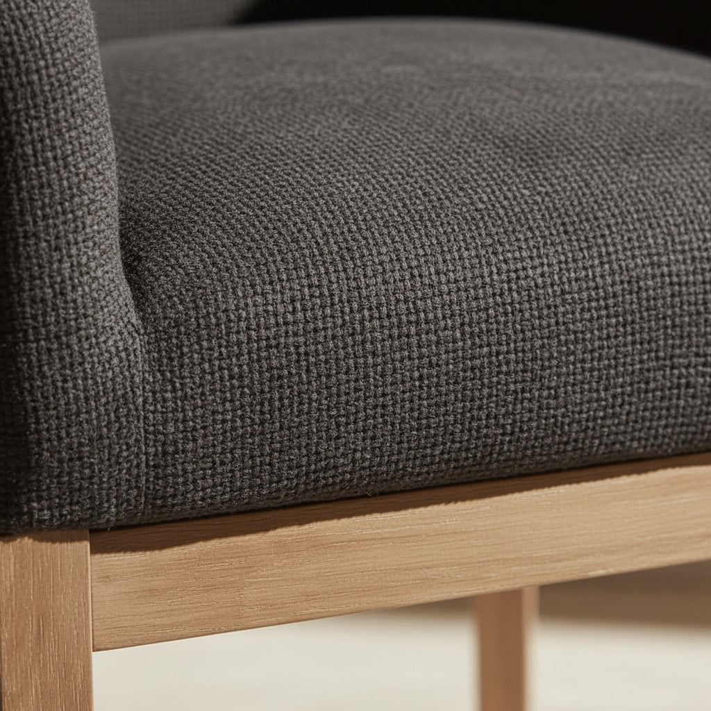 Son dossier courbé et ses accoudoirs fluides créent une présence chaleureuse et architecturale, tandis que l’assise capitonnée en lin noir apporte profondeur et texture.